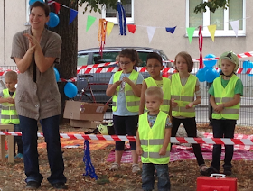 Und schon sind sie gelaufen. Es ging im schnellen Schritt zum Einsatzort - 2 Mal musste die "Polizei" bei uns die Straße sperren, denn so oft mussten wir die Straße überqueren um beim Spielplatz anzukommen.